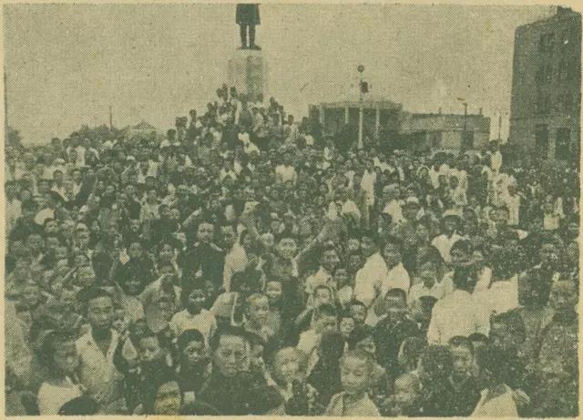 1945年,欣聞中國軍隊歸來,南京市民在新街口前